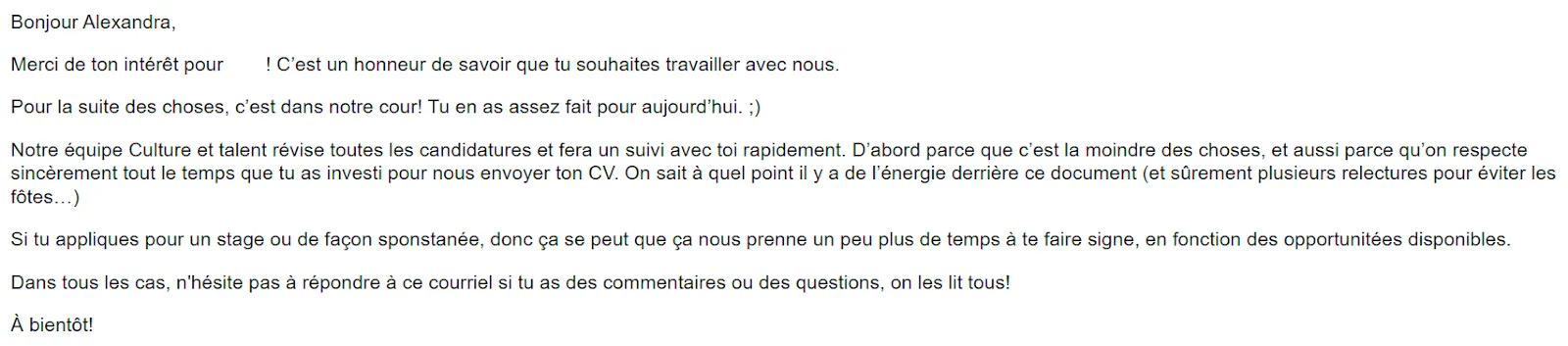 - Envoyez un accusé de réception automatique : dès qu’un candidat postule, envoyez un email personnalisé pour confirmer la bonne réception de sa candidature et l’informer des prochaines étapes. Cela montre que vous respectez son temps et son intérêt pour l’entreprise.
