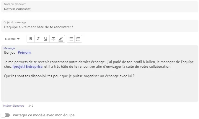- Templates de communication personnalisables : vous pouvez créer des modèles de message pour chaque étape clé du processus de recrutement. Cela permet d’automatiser et de personnaliser les communications tout en conservant un haut niveau de qualité dans vos échanges avec les candidats.