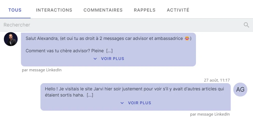- Historique complet des interactions : grâce à Jarvi, vous avez accès à l’historique complet des échanges avec chaque candidat, ce qui vous permet de personnaliser vos messages et de suivre précisément où en est chaque candidature.